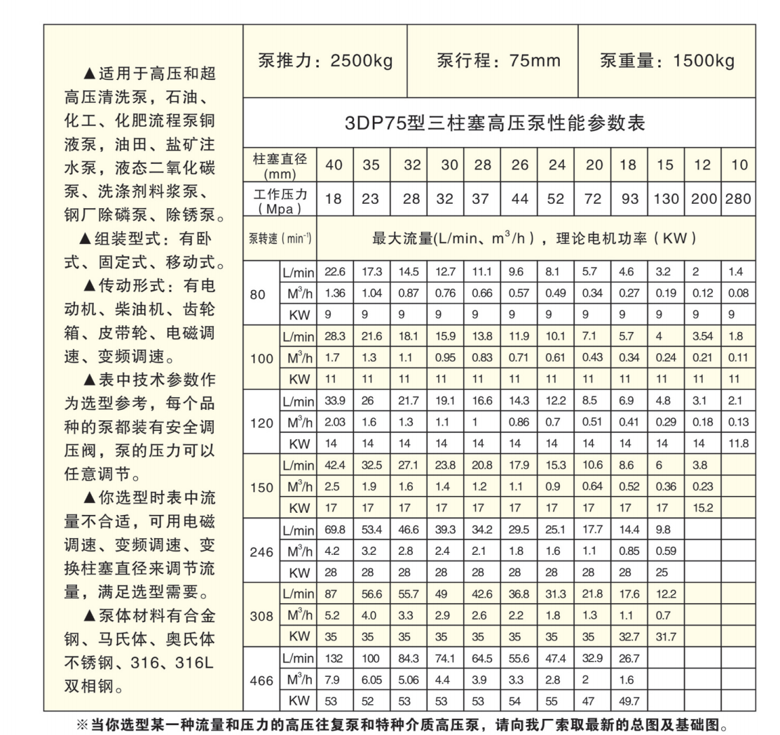 優(yōu)勢(shì):三柱塞高壓往復(fù)泵是工業(yè)泵中不可缺少的一類產(chǎn)品。它的突出優(yōu)點(diǎn)是:可獲得高的排出壓力,且流量與壓力基本無(wú)關(guān),適應(yīng)輸送介質(zhì)十分廣泛,吸入性能好,效率高,泵的性能不隨壓力和輸送介質(zhì)粘度的變動(dòng)而變動(dòng)。在當(dāng)今世界能源緊缺的形勢(shì)下,往復(fù)泵作為節(jié)能產(chǎn)品,在石油開(kāi)發(fā)、管道輸煤、煤氣化工、電站排渣、礦山開(kāi)采等方面起著重要作用,而且在壓力容器檢測(cè)和實(shí)現(xiàn)現(xiàn)代化石油化工工業(yè)全面自動(dòng)化操作方面也是不可缺少的品種。