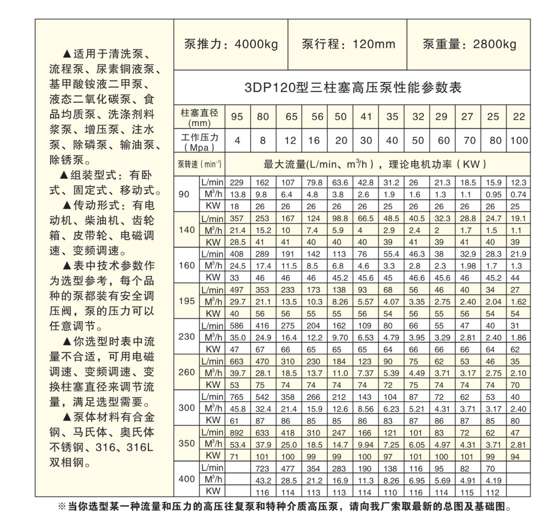 優勢:三柱塞高壓往復泵是工業泵中不可缺少的一類產品。它的突出優點是:可獲得高的排出壓力,且流量與壓力基本無關,適應輸送介質十分廣泛,吸入性能好,效率高,泵的性能不隨壓力和輸送介質粘度的變動而變動。在當今世界能源緊缺的形勢下,往復泵作為節能產品,在石油開發、管道輸煤、煤氣化工、電站排渣、礦山開采等方面起著重要作用,而且在壓力容器檢測和實現現代化石油化工工業全面自動化操作方面也是不可缺少的品種。